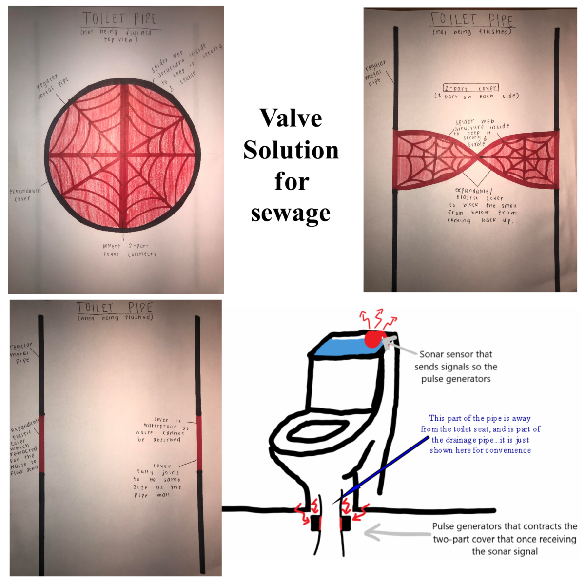 Sewage systems in many countries around the world are not advanced yet or they don’t have sewage systems at all. These countries have a large hole in the ground to store all the human waste. Since the toilet pipes are connected to the waste storage holes, the odor comes back up the pipe, out the toilet, and makes bathrooms smell terrible. Many countries have no way of stopping this odor without building a sewage system, but those are costly. Instead of dealing with the smell and constructing a sewage system, there can be a way to modify the pipes, using biomimicry, to stop the smell. Valves, similar to heart valves, could be built inside the pipes. These valves would open when flushing waste and close after flushing. The closing of these valves would restrict the foul waste smell from entering bathrooms.